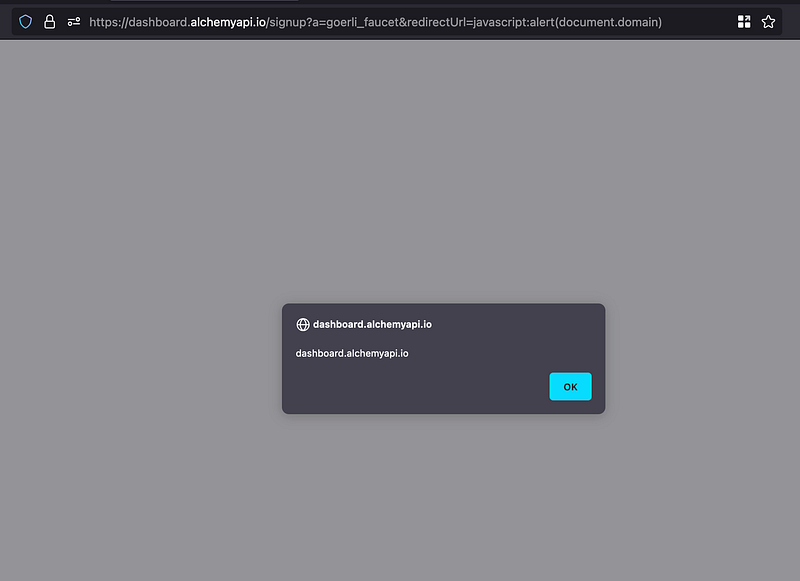We at CredShields were trying to get some Goreli testnet funds from https://goerlifaucet.com/. We tried authenticating via “Alchemy Login” and noticed the URL below.