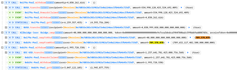- The attacker now converted the $5M BSC-USD to its $BUSD equivalent and transferred it into Allbridge’s bridge contract, resulting in large profits for the previous liquidity deposits.
