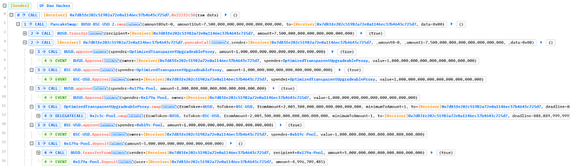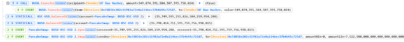 - The attacker began by getting a flash loan from PancakeSwap for $7.5M BUSD and then swapped $2M BUSD for $2M BSC-USD into the pool. The attacker transferred $5 million BUSD into a different pool and afterward exchanged it for its BSC-USD equivalent.