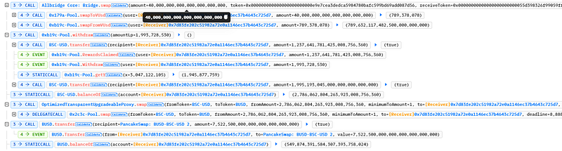- The attacker then only used $40,000 of BUSD to exchange $790,000 of BSC-USD from Bridge due to broken logic.