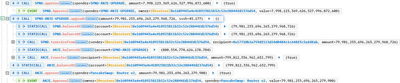 - The attacker executed the SPND-ANJI Upgrade function and approved the SPND token for the ANJI contract, which resulted in the approval of SPND tokens for their ANJI token equivalent.
