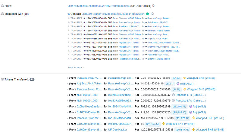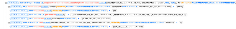 - The attacker then used PancakeSwap Router V2 to exchange the ANJI tokens for their WBNB counterpart, which resulted in the addition of 154 WBNB tokens to the attacker’s account.