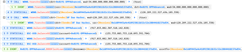 - The attacker then finished the flash loan, returned the 34 WBNB flash loan amount to the DPP Advanced contract, and transferred the remaining 120 WBNB to their wallet.