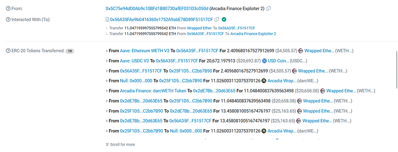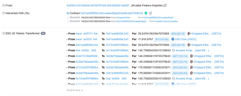 - The hacker began by manipulating the vaultManagementAction function, which was crucial for allowing ArcadiaFi to interact with other DeFi protocols and controlling the flow of assets.