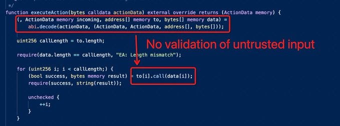 - The attacker abused the executeAction function to carry out unauthorized transactions. These transactions drained the funds from the vaults and redirected them into the control of the attacker.