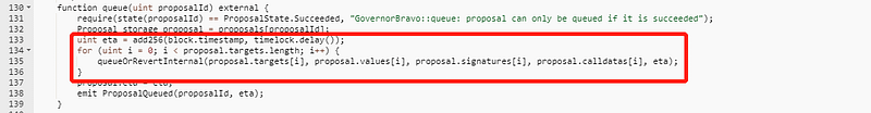 - The GovernorBravo contract only verifies the eta parameter (unlock time) when queuing a proposal, which allowed the attacker to execute the proposal once the time lock expired. After a lockup period of 172,800 seconds, the malicious contract was appointed as the proxy contract administrator for all tokens.