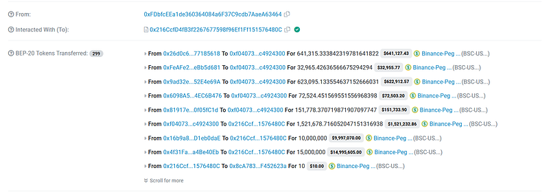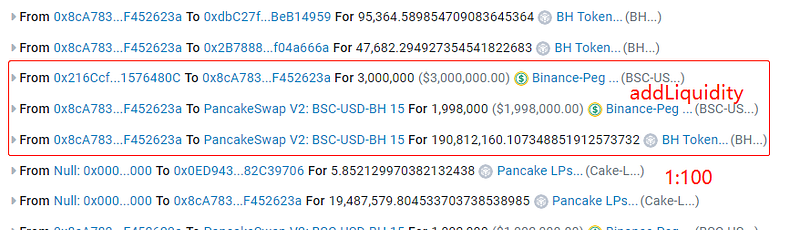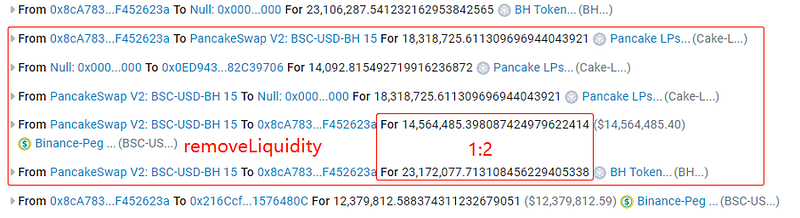 - The exploitation of this process resulted in a significant change in the liquidity removal ratio, which deviated from the typical 1 $USDT to 100 $BH tokens. The attacker managed to achieve a ratio of about 1 $USDT to 2 $BH tokens, which allowed them to withdraw a larger amount of $USDT than they initially put in.