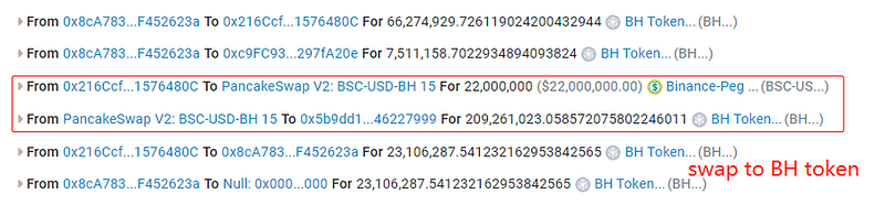 - Subsequently, the attacker swapped their borrowed $USDT for $BH tokens using this pair and carried out the 0x4e290832 function to remove liquidity.