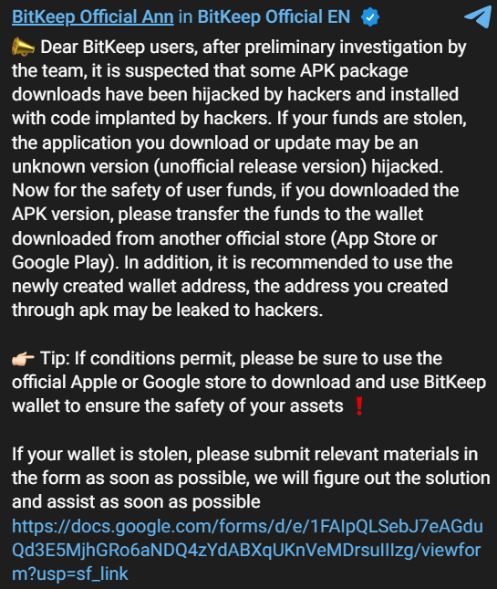 - Bitkeep officials discovered its users complaining about crypto wallets that do not require validation being emptied. Following an internal investigation, it was discovered that attackers hijacked unofficial versions of the Bitkeep Android app that had not yet been publicly published.