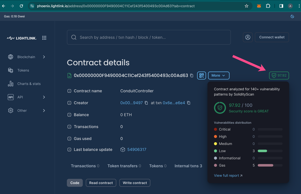 For developers and users alike, utilizing this feature is straightforward. Upon visiting Blockscout and accessing a verified contract, the security score generated by SolidityScan is displayed next to the shield icon. Clicking on the “View Full Report” button runs a Quickscan & reveals a comprehensive report detailing various aspects of the contract’s security, including functions, upgradeability, ownership details, and an overall threat score.