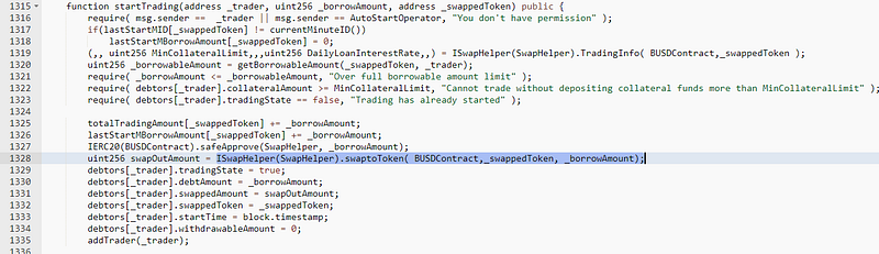 - The swaptoToken() method of the SwapHelper contract was invoked within the startTrading() function.