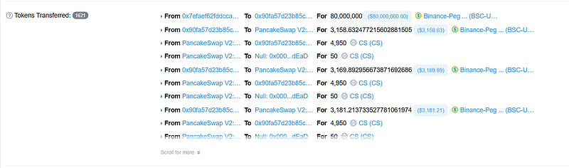 - The attacker borrowed BSC-USD via flashloan and swapped it into $CS.
