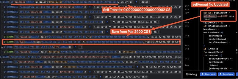 sellAmount. By transferring to themselves, the attacker triggeredsync(), where thesellAmountfrom the previous step was used, and the function burned $CS in the pair.