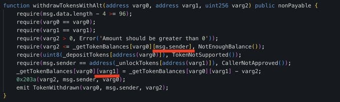 - In the same transaction, the attacker executed the ‘withdrawTokensWithAlt’ function. This function had two critical issues: