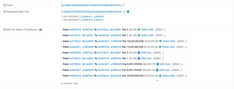 - Following these steps, the attacker executed the ‘withdrawTokens’ function on behalf of the helper exploit contract, draining all the USDT and then the USDC from the vulnerable contract.