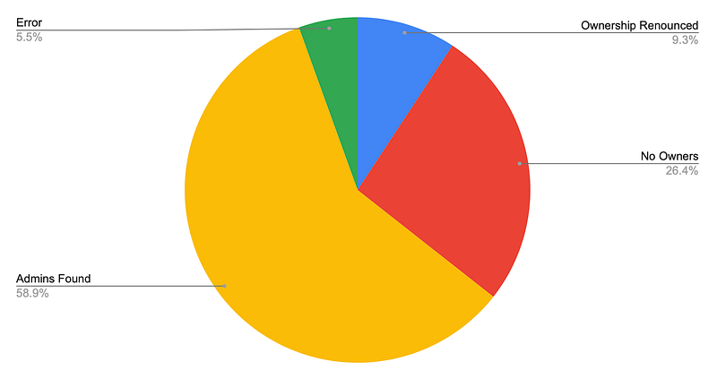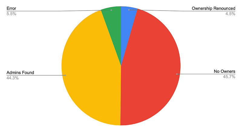 We picked the top 3278 contracts from CoinMarketCap. We got 2213 Ethereum smart contracts and 1068 BSC Smart Contracts to analyze how many contracts have renounced ownership or don’t have any owner.