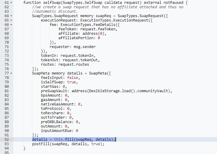 selfSwap()method. Further modifications to the call data were sent to thefill()method, which lacked routerID validation and enabled attackers to submit the routerID of their owned contract address which was not verified on-chain.