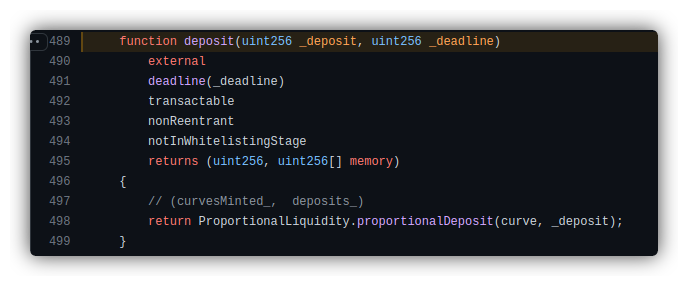 - The borrowed USDC and XIDR were then redeposited into the transaction pair contract by the assailants using the deposit () method. Link to the code — https://github.com/dfx-finance/protocol-v1-deprecated/blob/5fbeac837e57ded52e25572390a90c189ef363b1/contracts/Curve.sol#L489