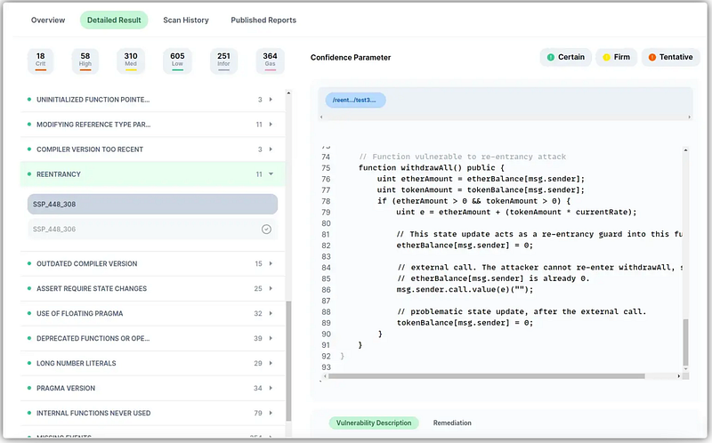 - Scan your contract against the latest common security vulnerabilities with 130+ patterns at SolidityScan, which includes the detection of Re-entrancy vulnerabilities.