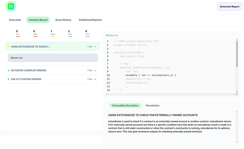 Our cloud-based smart contract security scanner SolidityScan can automatically find vulnerabilities related to insecure EXTCODESIZE checks.