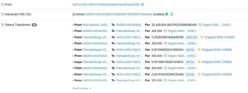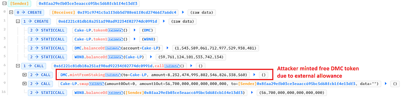 - By exploiting this missing access control, the attackers created 4,06,42,278 DMC tokens and exchanged them for WBNB equivalents via a pancake swap, costing DMC holders roughly 60 WBNB. The project was informed of the compromise and relaunched the initiative as a result.