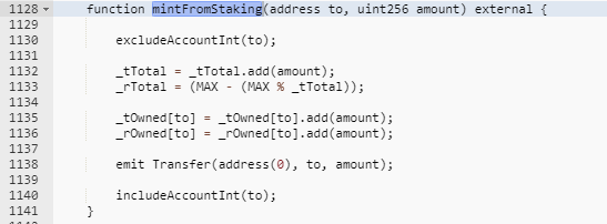 requirestatement to check that any state changes that occur within the mintFromStaking function are valid. For example, you could check that the _tTotal and _rTotal variables are not exceeding the maximum supply of the token. - Consider setting a gas limit for the mintFromStaking function to prevent it from consuming too much gas and potentially causing the transaction to fail. You can set a gas limit using the gas keyword.