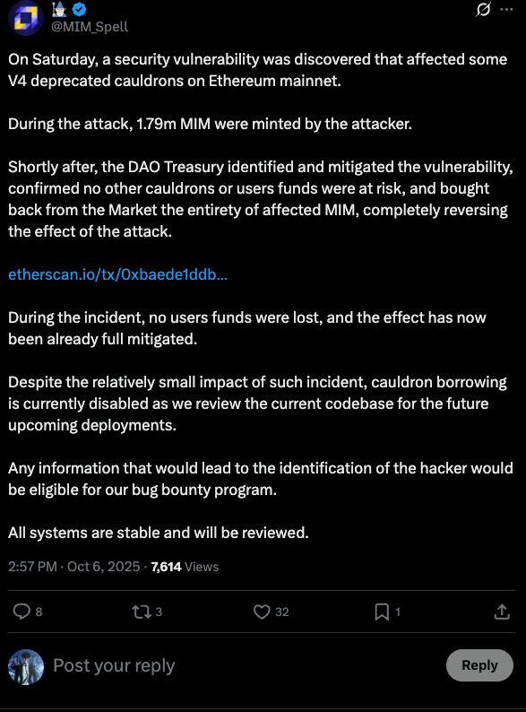 - Abracadabra Team acknowledged the incident via their official X account: https://x.com/MIM_Spell/status/1975130787486831018