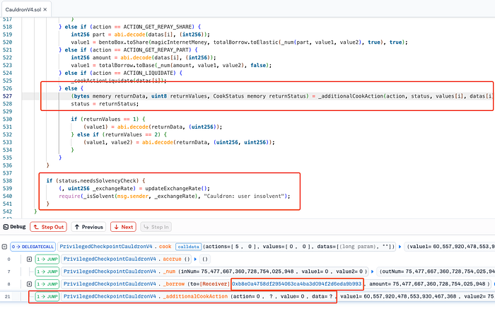 cook()function on multiple CauldronV4 contracts, passingactions = [5, 0]to trigger the exploit.