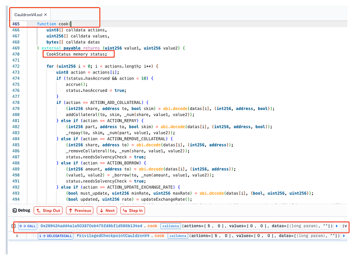 The vulnerability was located in the cook() function of the PrivilegedCauldronV4 and PrivilegedCheckpointCauldronV4 contracts, where an uninitialized “else” branch unintentionally reset internal status flags, disabling collateral checks during borrow operations.