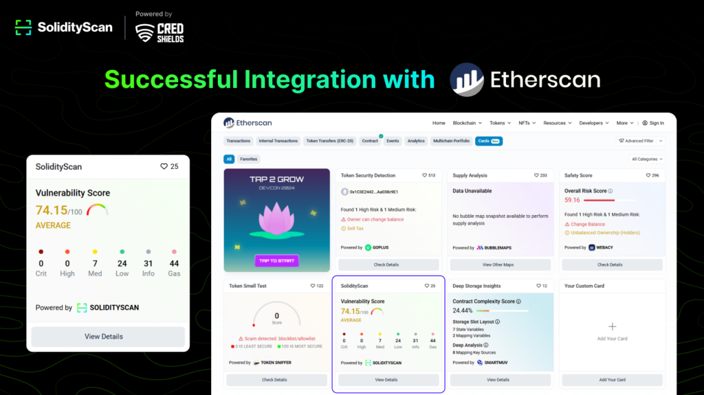 The integration of SolidityScan with Etherscan empowers developers and users alike, providing a seamless way to assess and improve smart contract security. By offering real-time vulnerability detection, actionable recommendations, and transparency, SolidityScan enhances trust and safety within the Ethereum ecosystem.