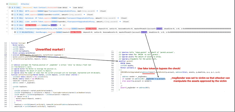 - The attacker managed to bypass the permit verification in the DebtManager contract’s leverage function by inserting a fake market address without validation and altering the _msgSender to mimic the victim’s address.
