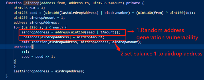 _airdrop()function is intended to distribute $FFIST tokens randomly to different addresses. - Unfortunately, the randomness of airdrop addresses can be predicted due to manipulable parameters such as the last airdrop address, block number, from & to addresses.