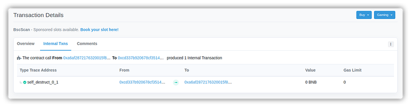 - The contract that the attacker deployed had a “self-destruct” clause that was triggered by the attacker as soon as the malicious transactions were completed.