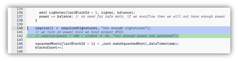 - The L142 was used to verify the power value. The code was commented out. The attacker used the signature function and triggered the function call to upsurge the oracle price.