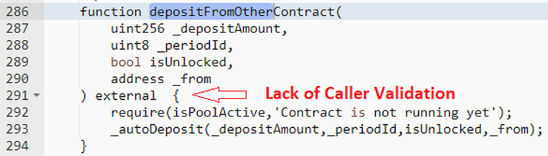 - The GymSinglePool contract added a new capability to deposit tokens from other contracts that lacked validation on visibility and access control of the function caller. The depositFromOtherContract() method was designated as “external,” meaning anybody could call it.