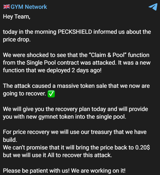 While GYM NETWORK was focused on developing the ideal exercise for its members to receive the most yields and incentives, a new feature was implemented that caused the project to lose $2.1 million (or 7.5K BNB) and crashed the price of the GYMNET token.