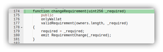 2. 0x812d8622C6F3c45959439e7ede3C580dA06f8f25 changeRequirement()function which allowed the change of the number of required confirmations.