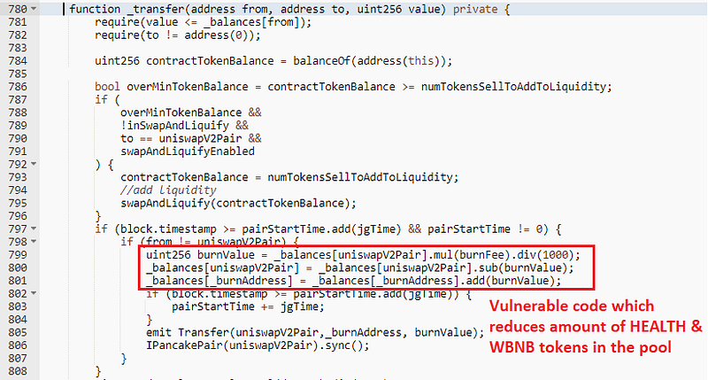 - In the end, the attacker sold the inflated health tokens and converted 30565652.26 HEALTH tokens for 56.64 WBNB equivalent.