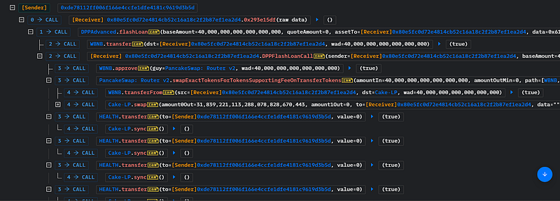 - To begin, Attacker flash borrowed 40 WBNB and swapped them for 31839221.11 HEALTH tokens.