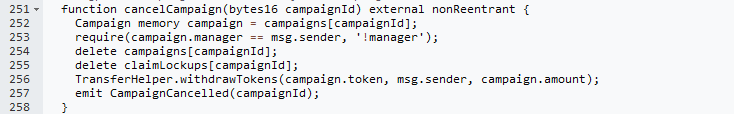 - Ensure that allowances granted to contracts are properly revoked when they are no longer needed. After the campaign is canceled and funds are withdrawn, the allowance from the ClaimCampaigns contract to the campaign manager should be revoked immediately.