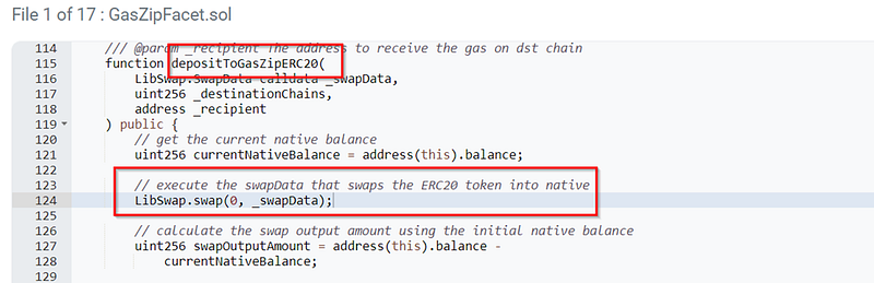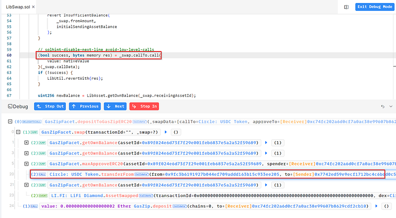 · The root cause is that the function depositToGasZipERC20 in GasZipFacet.sol allowed _swapData to be passed directly to LibSwap.swap, which included a low-level call (shown in Fig: Vulnerable Code) that can execute arbitrary functions. As _swap.callTo and _swap.callData is user-controlled, the attacker could craft a malicious calldata with transferFrom() calls.