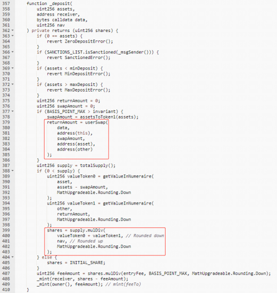- Following the second reentrancy, the contract minted tokens for the hacker based on the ratio of 2.5M USDT to the previous balance of USDT in the contract. Subsequently, the hacker deposited another 2.5M USDT after the completion of the first reentrant deposit function.