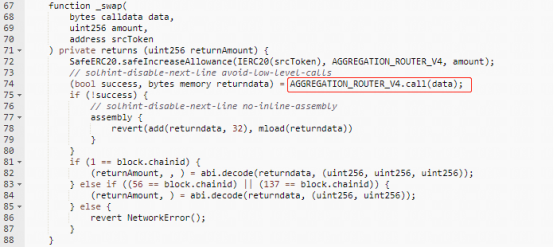 - During the swap operation, the attacker’s contract was invoked, triggering the first reentrancy. By calling the deposit function, the attacker performed a second reentrancy and deposited an additional 2.5M USDT into the contract.