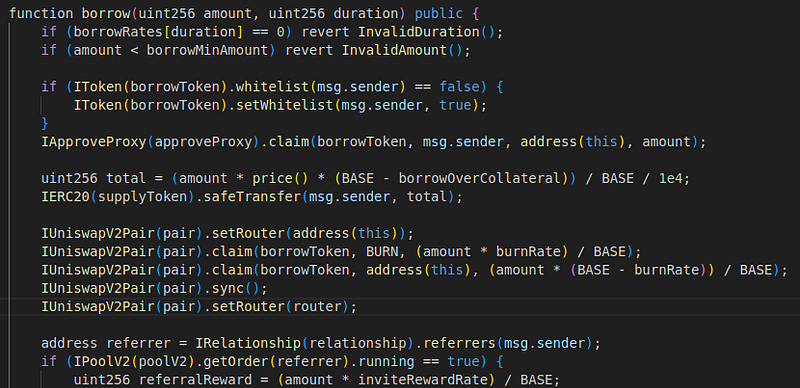 - Also, in the “borrow” function, the price of MO tokens was figured out by looking at how many MO tokens and USDT were in the pair. With repeated borrowings, the price of MO went up a lot.