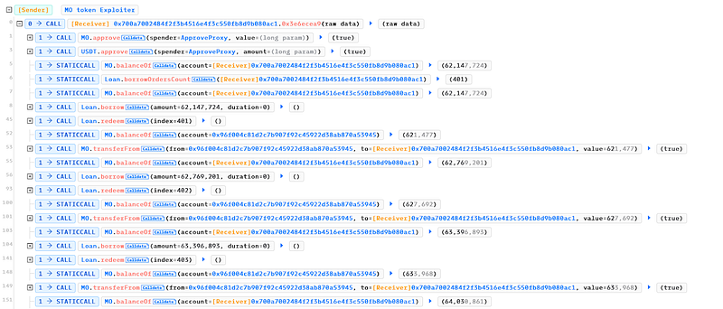 - The hacker kept repeating the “borrow” and “redeem” actions, finding the root cause in the “borrow” function. This function moved MO tokens from a pair to a BURN address.