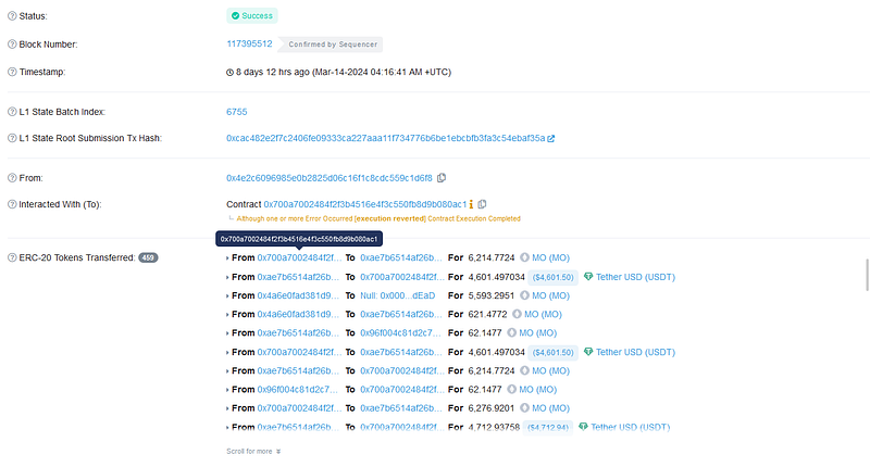 On March 14, 2024, MO suffered an attack due to a business logic vulnerability, leading to an approximate loss of over 413K USDT.
