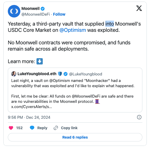 - Importantly, all Moonwell lending pools remain secure and unaffected by this exploit. The breach was limited to the Moonhacker vaults, which were designed to interact with Moonwell markets without adequate security safeguards. More Details here: https://x.com/MoonwellDeFi/status/1871593325050093793