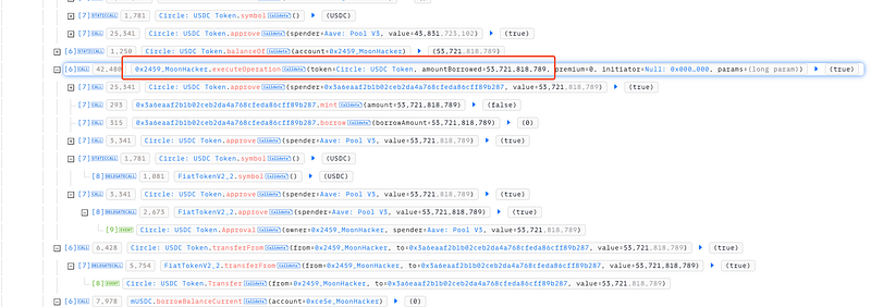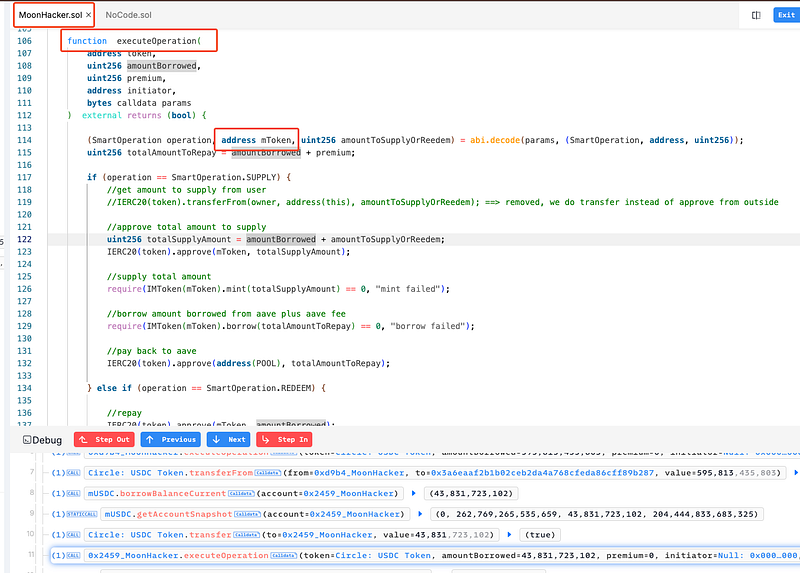 mTokenaddress in theexecuteOperationfunction. The function approved the malicious contract to transfer the vault’s USDC tokens. Using the unauthorized approval, the attacker drained the USDC tokens held in the vault. - The attacker then called