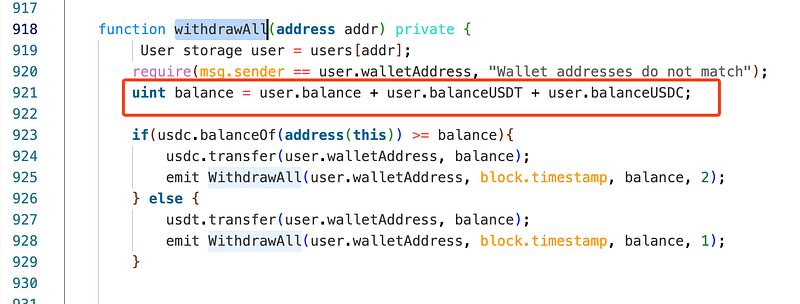 withdrawAllfunction calculates the total withdrawal amount usinguser.balance + user.balanceUSDT + user.balanceUSDC.