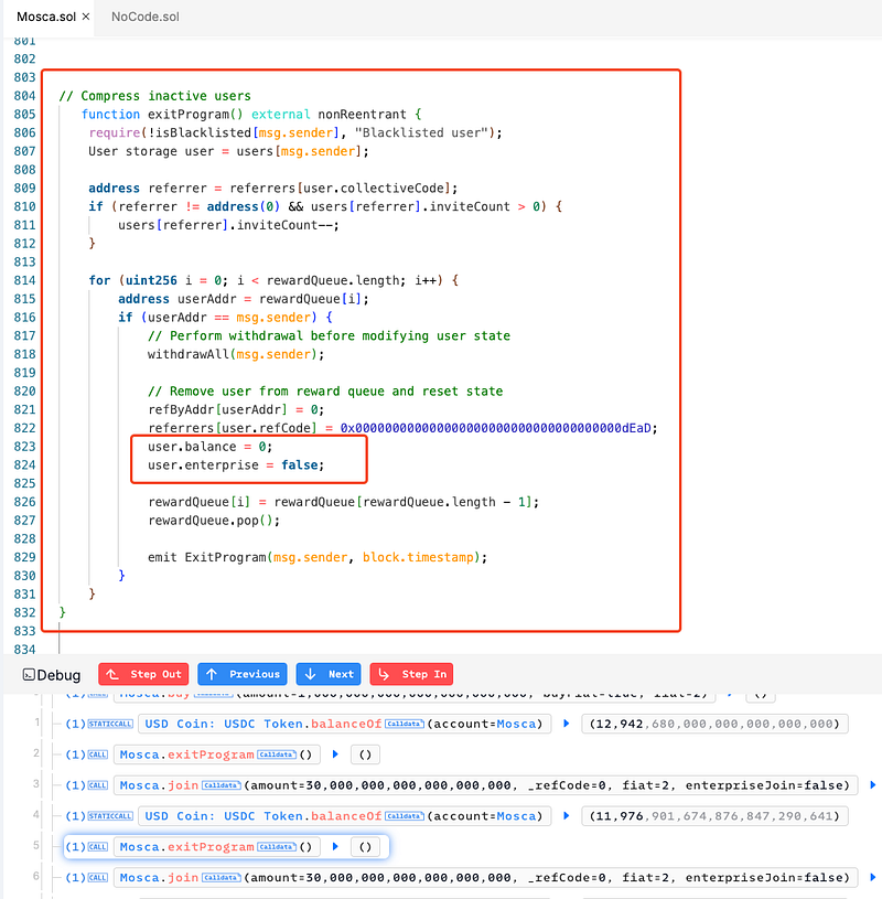 buyfunction to increase theiruser.balanceUSDC. Then, they invoked thejoinfunction to push their address into therewardQueue. And executed theexitProgramfunction multiple times, exploiting the incomplete reset ofuser.balanceUSDTanduser.balanceUSDC. - The attacker withdrew tokens repeatedly, ultimately gaining approximately $19.5K.